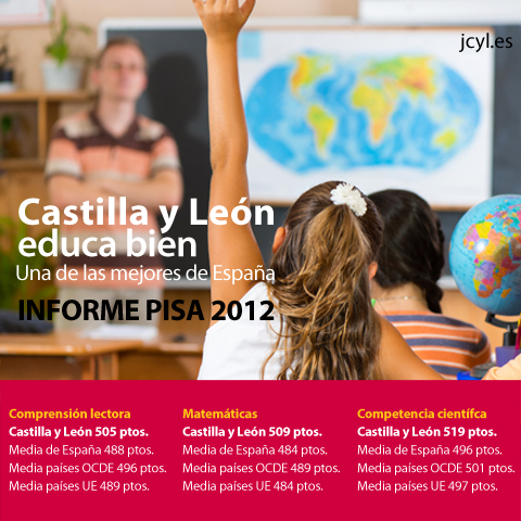 Castilla y León obtiene resultados excelentes en el Informe PISA 2012Castilla y León obtiene resultados excelentes en el Informe PISA 2012, situándose a la cabeza en calidad educativa de España y de la OCDE. El sistema educativo de Castilla y León ha obtenido resultados excelentes en los tres ámbitos de conocimiento analizados en PISA 2012 que la sitúan a la cabeza de España en calidad educativa. En el área de Matemáticas ha alcanzado 509 puntos (España 484 y 494 OCDE), en Lectura 505 (España 488 y 496 OCDE) y en Ciencias 519 (España 496 y 501 OCDE). Además, Castilla y León cuenta con una mayor proporción de alumnado excelente que la Unión Europea, la OCDE y España, al tiempo que la Comunidad dispone de una proporción de estudiantes rezagados notablemente más baja. |